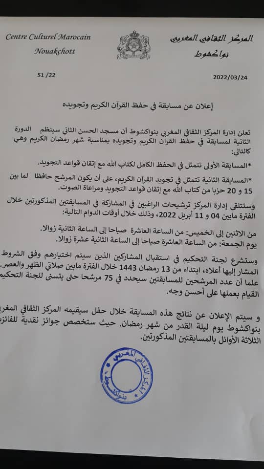 أعلن المركز الثقافي المغربي بنواكشوط عن تنظيم الدورة الثانية من مسابقته في القرآن الكريم وتجويده، وذلك بمناسبة شهر رمضان المبارك. وقال المركز إن المسابقة ستنظم على مستويين هما، حفظ القرآن الكريم كاملا، مع إتقان قواعد التجويد، وحفظ 15 إلى 20 حزبا من القرآن، مع إتقان قواعد التجويد، ومراعاة الصوت. وأكدت …