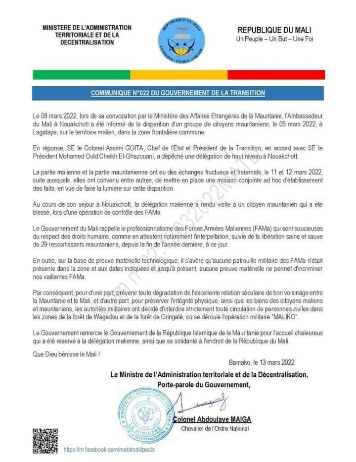 أعلنت السلطات المالية فرض “حظر بات لأي حركة للمدنيين في منطقتي غابة واغادو وغابة غرينغالي” غير بعيد من الحدود الموريتانية، وجددت نفي مسؤولية جيشها عن الأحداث الأخيرة التي أودت بحياة عدة مواطنين موريتانيين. وقالت السلطات المالية في بيان وقعه وزير الإدارة الترابية واللامركزية، الناطق باسم الحكومة العقيد عبد الله مايغا، …