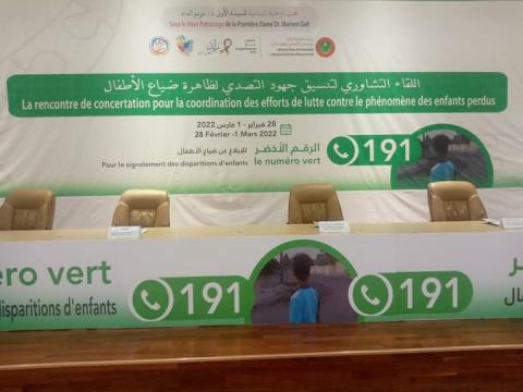 من المقرر أن تترأس السيدة الأولى مريم بنت الداه حفل افتتاح اللقاء التشاوري لتنسيق جهود التصدي لظاهرة ضياع الأطفال. وسيقام الحفل بمباني الأكاديمية الدبلوماسية بوزارة الخارجية. وتولي السيدة الأولى بنت الداه أهمية قصوى لقضايا الأطفال، والتحسين من ظروفهم.