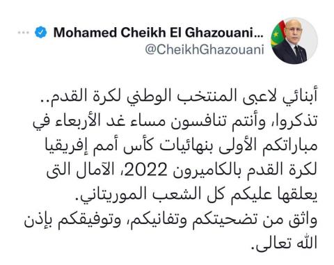 قال رئيس الاتحادية الوطنية لكرة القدم إنه يثمن الدعم المعنوي الذي يقدمه رئيس الجمهورية محمد ولد الشيخ الغزواني للمنتخب الوطني قائلا بان الرسالة ستؤتي أكلها و كتب في تدوينة معلقا على تغريدة للرئيس غزواني باسمي شخصياً، وباسم بعثة المنتخب الوطني، أتقدم بجزيل الشكر لفخامة رئيس الجمهورية السيد محمد ولد الشيخ …