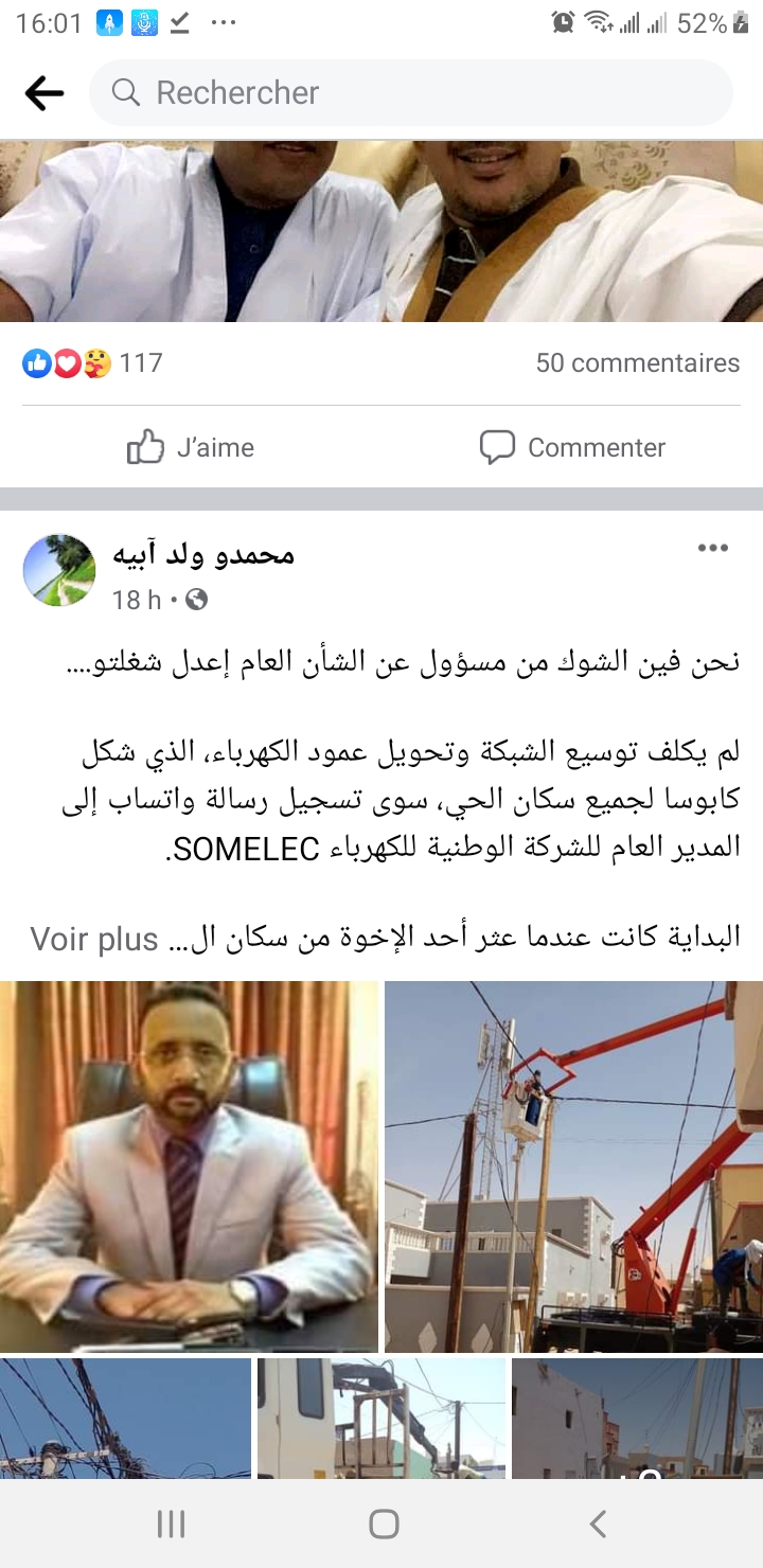 نحن فين الشوك من مسؤول عن الشأن العام إعدل شغلتو…. لم يكلف توسيع الشبكة وتحويل عمود الكهرباء، الذي شكل كابوسا لجميع سكان الحي، سوى تسجيل رسالة واتساب إلى المدير العام للشركة الوطنية للكهرباء SOMELEC. البداية كانت عندما عثر أحد الإخوة من سكان الحي، والمتضررين طبعا من ضعف الشبكة على الرقم …