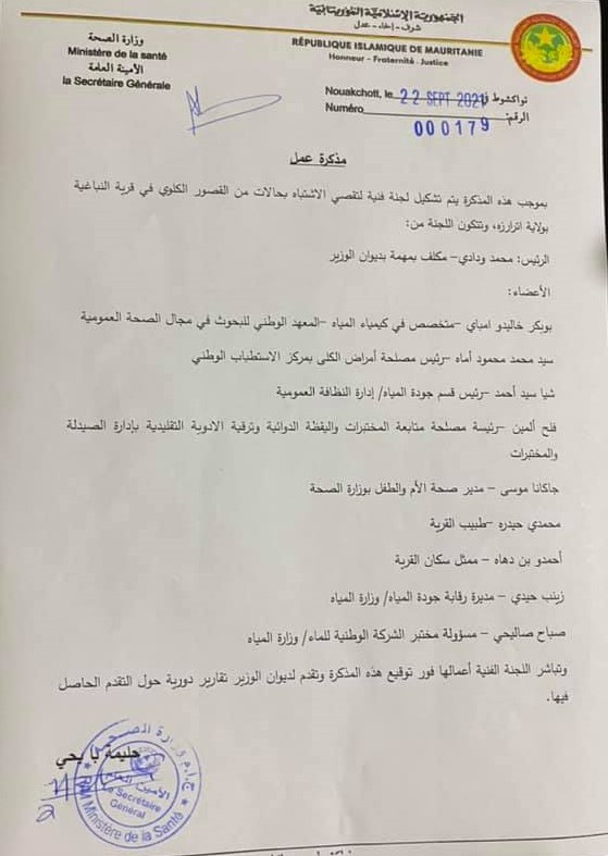 أعلنت وزارة الصحة عن تشكيل لجنة فنية للتقصي عن اشتباه بحالات قصور كلوي في قرية النباغية بولاية الترازة. وتضم اللجنة ممثلين عن وزارتي الصحة والمياه والصرف الصحي، إضافة لممثلين عن السكان، وستباشر عملها ابتداء من اليوم. ويرأس اللجنة المكلف بمهمة بديوان الوزير محمد ودادي، وتضم في عضويتها: – بوبكر خاليدو …