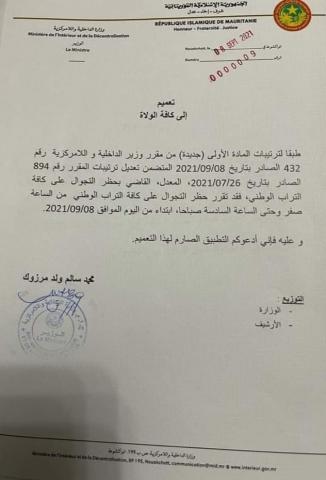 أصدر وزير الداخلية واللامركزية محمد سالم ولد مرزوك تعميما إلى كافة ولاة الولايات يتضمن تعليمات صارمة بضرورة العمل على التطبيق التام لمقرره الأخير رقم 432 بتاريخ 08 / 09 / 2021. و أكد الوزير، في تعميمه للولاة، على ضرورة الالتزام بترتيبات المقرر المذكور و المتعلقة بحظر التجول من منتصف الليل …