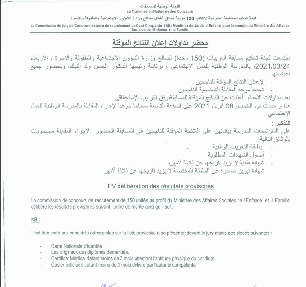 أعلنت اللجنة الوطنية للمسابقات اليوم السبت نتائج مسابقة اكتتاب 150 مربية أطفال لصالح وزارة الشؤون الاجتماعية والطفولة والأسرة. ودعت اللجنة المشرفة على المسابقة من وردت أسمائهم في اللائحة للحضور للمقابلة يوم 08 إبريل القادم. كما دعتهم لإحضار بطاقة تعريف، وأصول الشهادات المطلوبة، إضافة لشهادتي صحة وتبريز حديثتين. المصدر موقع الأخبار