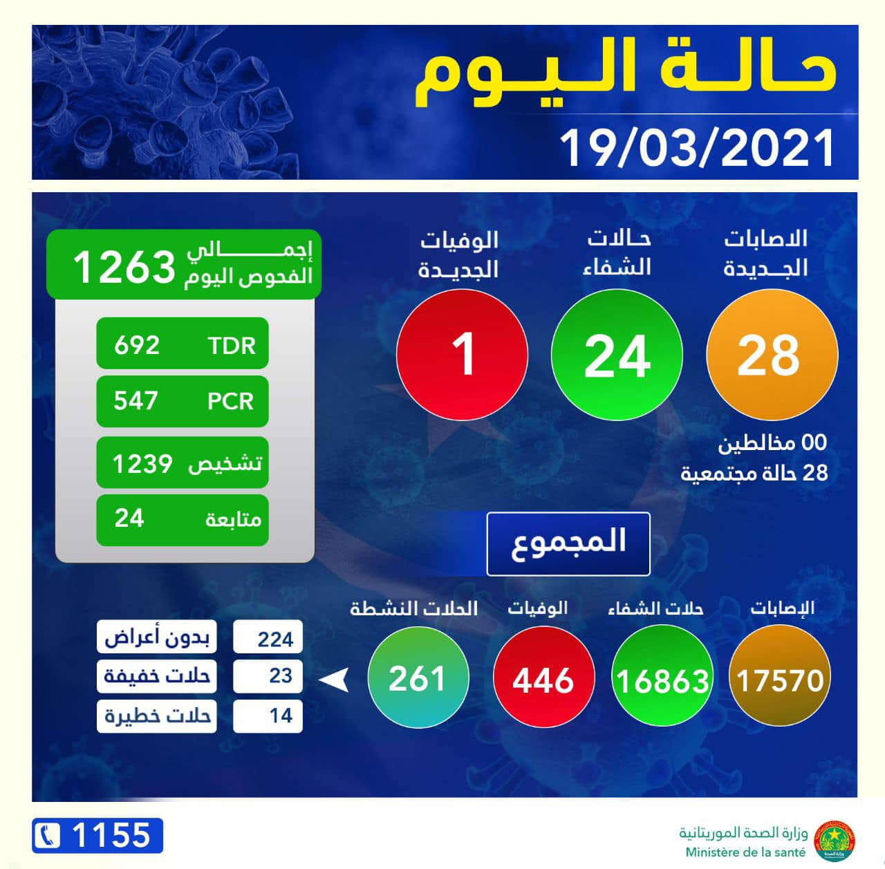 الإصابات الجديدة: 28 حالات الشفاء: 24 حالات الوفاة: 01 مجموع الفحوص اليوم: 1263 TDR: 692 PCR: 547 المتابعة: 24 التشخيص: 1239 توزيع الحالات المسجلة اليوم على المقاطعات. عدد الحالات المسجلة: 28 باسكنو 1 كنكوصة 1 كيفه 1 مونكل 1 الاك 1 نواذيبو 4 ولد ينجه 1 بنشاب 1 لكصر 8 …