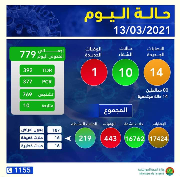 حالة اليوم الإصابات الجديدة: 14 حالات الشفاء: 10 حالات الوفاة: 01 —– مجموع الفحوص اليوم: 779 TDR: 392 PCR: 377 المتابعة: 10 التشخيص: 769 توزيع الحالات المسجلة اليوم على المقاطعات. عدد الحالات المسجلة: 14 باسكنو 2 باركيول 2 المذرذرة 1 واد الناقة 1 نواذيبو 2 بنشاب 1 لكصر 1 تفرغ …