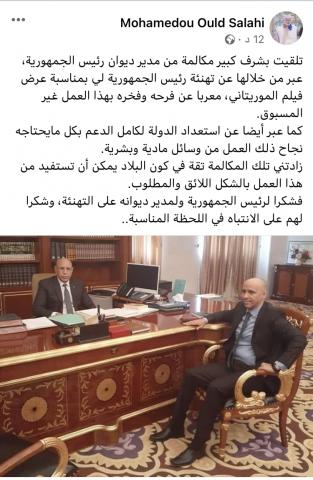 السجين الموريتاني السابق في معتقل اغوانتانامو محمدو ولد صلاحي إن مدير ديوان الرئيس محمد ولد الغزواني أبلغه خلال مكالمة هاتفية بتهنئة الرئيس له على عرض فيلمه، الرئيس غزواني يهنئ ولد صلاحي على عرض فيلمه The Mauritanian، و”فرحه وفخره بهذا العمل غير المسبوق”. وأضاف ولد صلاحي في تدوينة له على الفيسبوك …