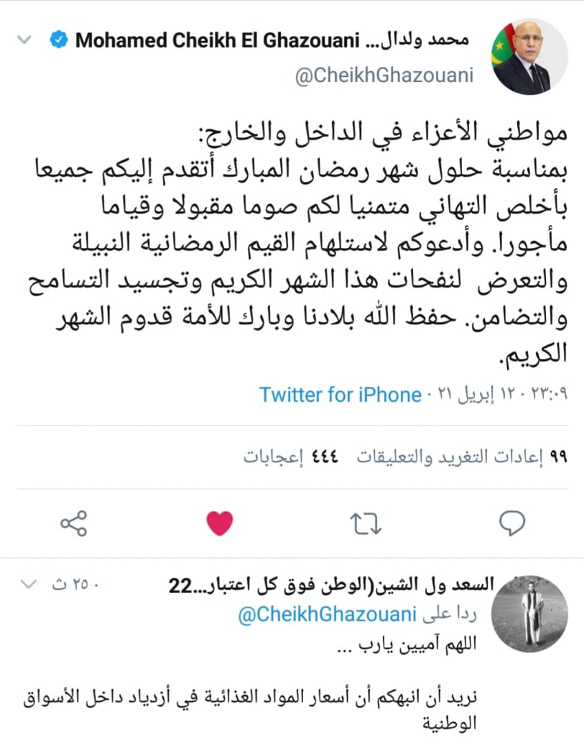 هنأ فخامة رئيس الجمهورية السيد محمد ولد الشيخ الغزواني، الشعب الموريتاني بمناسبة حلول شهر رمضان المبارك. وجاء في تغريدة لفخامته : “مواطني الأعزاء في الداخل والخارج بمناسبة حلول شهر رمضان المبارك أتقدم اليكم جميعا بأخلص التهاني متمنيا لكم صوما مقبولا وقياما مأجورا. وأدعوكم لاستلهام القيم الرمضانية النبيلة والتعرض لنفحات هذا …