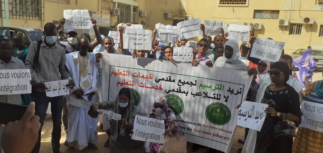 شهدت وزارة التهذيب في انواكشوط اليوم الاربعاء تظاهر عدد من مقدمي الخدمات التعليمية المطالبين بدمجهم في الوظيفة العمومية ,رافعين شعارات على غرار :”لاللتلاعب بمقدمي خدمات التعليم, نريد الترسيم لجميع مقدمي الخدمات . المتحدث باسم مقدمي خدمات التعليم قال إنهم محرومون من كل العلوات باستثناء علاوة البعد مع معاناتهم من ضعف …