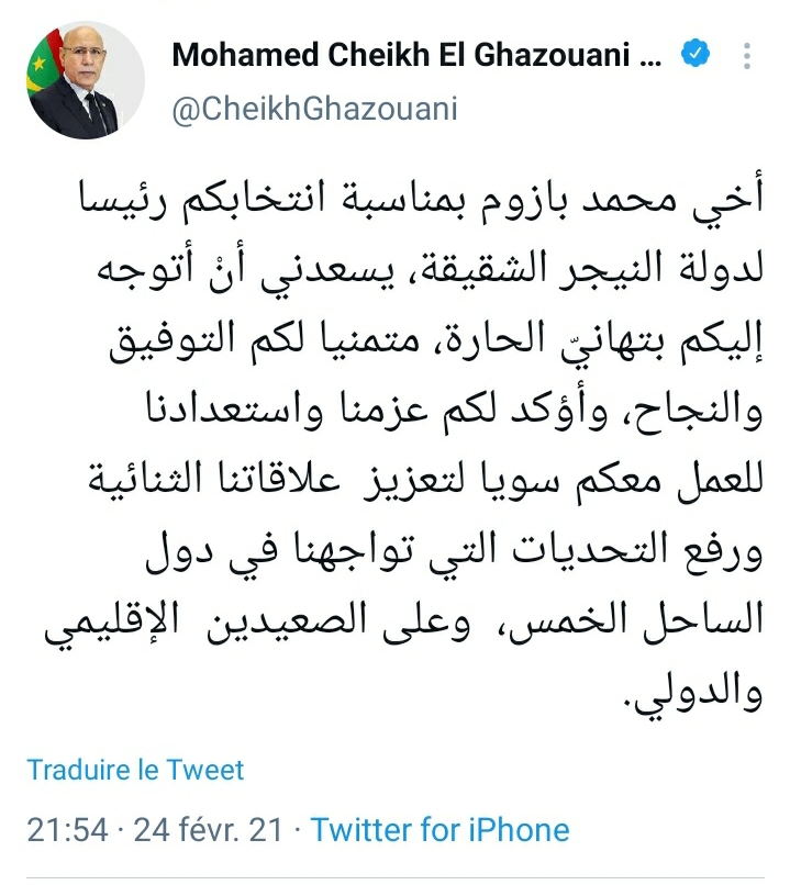 هنأ رئيس الجمهورية السيد محمد ولد الشيخ الغزواني قبل قليل على حسابه على تويتر الرئيس النيجري المنتخب السيد محمد بازوم متمنيا له التوفيق ومبديا استعداده للتعاون في سبيل تعزيز العلاقات الثنائية بين بلادنا والشقيقة النيجر وهذا نص التدوينة ” أخي محمد بازوم بمناسبة انتخابكم رئيسا لدولة النيجر الشقيقة، يسعدني أنْ …