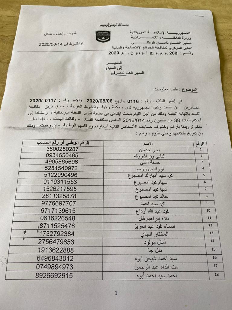 انتشرت قبل لحظات وثيقة موجهة من إدارة الأمن إلى مدراء مصارف موريتانيا تطلب الحصول على كشوفات حسابات عشرات المسؤولين من بينهم وزراء في عشرية محمد ولد عبد العزيز. وقد تضمنت الرسالة أيضا أسماء أفراد من عائلة الرئيس السابق هذا بالإضافة إلى لفيف من المسؤولين ورجال الأعمال وحتى أجانب ، في …