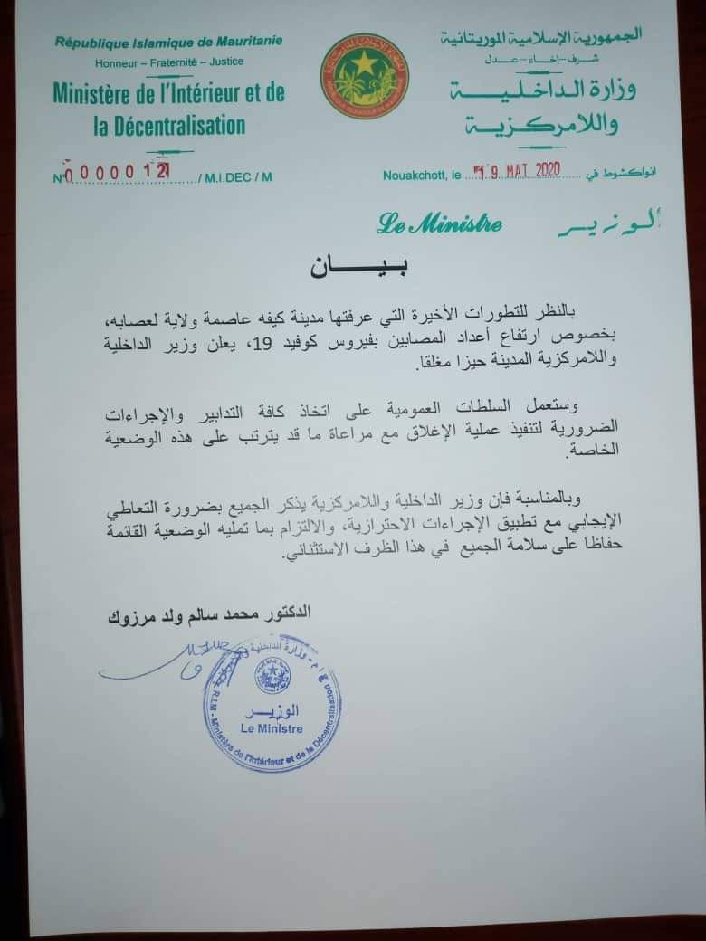 أعلن وزير الداخلية واللامركزية الدكتور محمد سالم ولد مرزوك مدينة كيفة عاصمة ولاية لعصابه حيزا مغلقا وذلك من أجل عزلها بشكل تام . وقد جاء في الوثيقة التي حصل موقع السياسي على نسخة منها أن القرار جاء نظرا للتطورات الأخيرة والتي عرفتها المدينة بخصوص ارتفاع عدد الإصابات بكورونا. وقد سجلت …