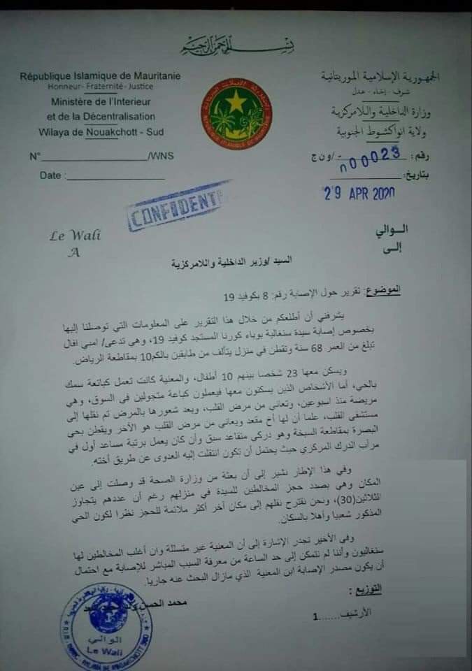 انتشرت قبل لحظات رسالة مسربة كانت موجهة من والي ولاية انواكشوط الجنوبية إلى وزير الداخلية تحتوي على معلومات هامة عن السيدة المصابة بفيروس كورونا وهي ثامن حالة مؤكدة في البلاد وبحسب الرسالة المسربة فإن الأمر يتعلق بسيدة تبلغ من العمر 68 عاما سنغالية الجنسية تقطن في بيت من طابقين ويأوي …