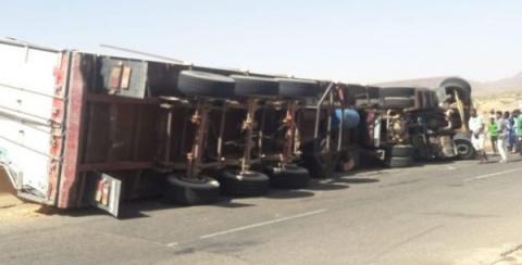 انقلبت شاحنة صباح أمس الأحد 09 فبراير 2020، على الطريق الرابط بين مدينة (أطار _ عين أهل الطايع) شمال موريتانيا. ولم يؤدي انقلاب الشاحنة إلى أي إصابات، غير أنه تسبب في إغلاق الطريق بشكل جزئي عند قرية “عين أهل الطايع” الواقعة على بعد حوالي 35 كلم من مدينة اطار.