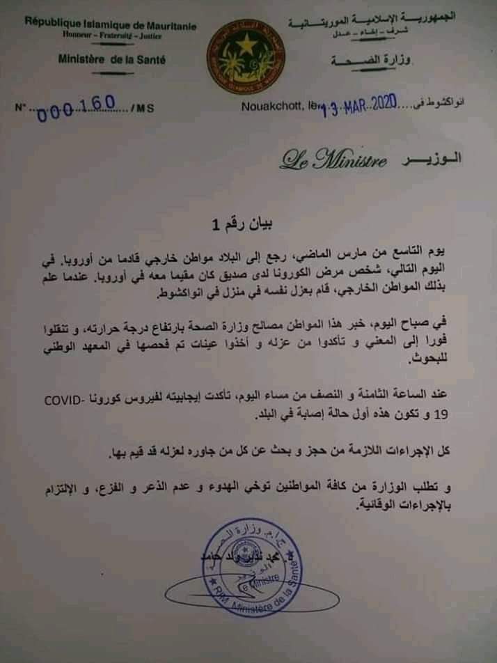 اعلنت وزارة الصحة الموريتانية مساء اليوم ظهور اول حالة من فيروس كورونا “كوفيد19” لشخص قدم من أوروبا. وحسب بيان صادر مساء اليوم وقعه وزير الصحة فإن المصاب بلغ عن نفسه وتم حجزه قبل وقت لنتأكد إصابته. وأشار البيان إلى أن البحث جاري عن من ألتقى بهم المصاب حت يتم حجزهم. …