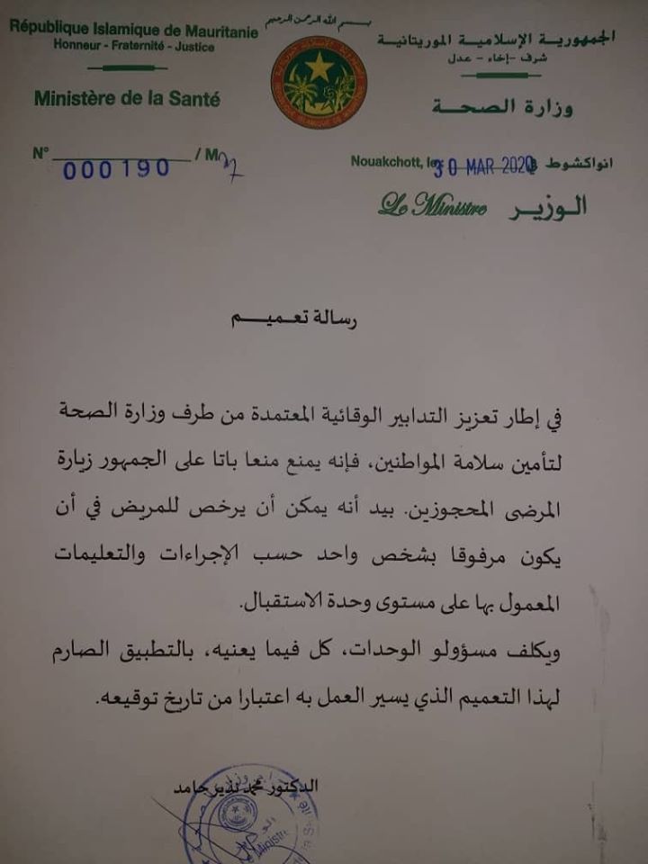 أصدرت وزارة الصحة الموريتانية تعميما بمنع زيارة المرضى المحجوزين في المستشفيات، ضمن إجراءات الوقاية من فيروس كورونا. وقالت الوزارة إنه يمكن أن يرخص للمريض في أن يكون مرفوقا بشخص واحد حسب الإجراءات والتعليمات المعمول بها على مستوى وحدة الاستقبال. وبحسب التعميم يكلف مسؤولو الوحدات كل فيما يعنيه بـ”التطبيق …