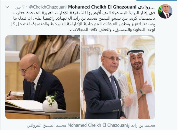 بدأ الرئيس محمد ولد الغزواني التغريد على حسابه في اتويتر بالتعليق على زيارته للإمارات، مؤكدا أنها عكست صورة صادقة عن عمق روابط الأخوة التي تجمع بين الشعبين الشقيقين الموريتاني والإمارات وقوة تعاونهما الثنائي، وإرادتهما المشتركة في زيادته متانة ورسوخا. وأكد غزواني في أول تغريدتين على حسابه الذي أطلق ديسمبر …