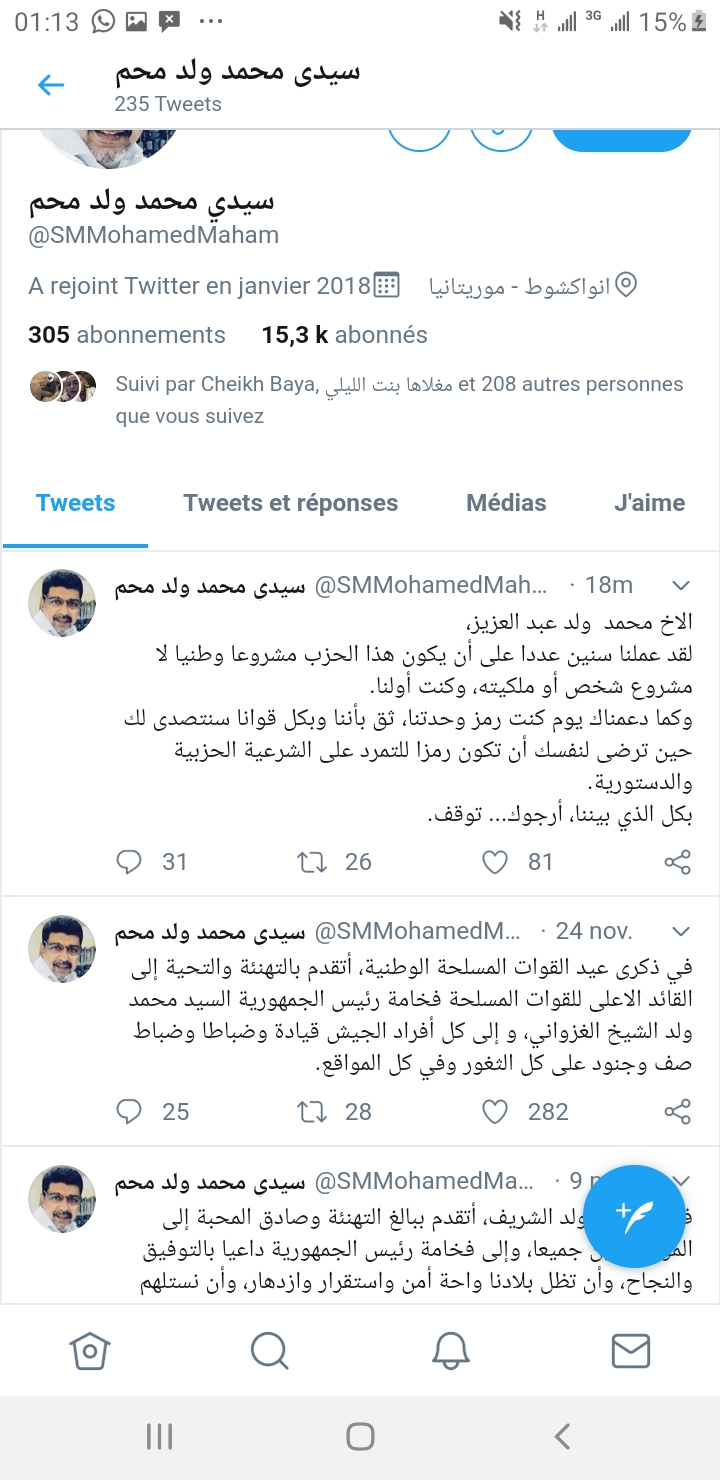 حذر الرئيس السابق لحزب الإتحاد من أجل الجمهورية والوزير السابق سيد محمد ولد محم, الرئيس السابق محمد ولد عبد العزيز من مغبة محاولته فرض نفسه بالقوة ,واضاف ولد محم في تغردة على حسابه على تويتر مخاطبا, الرئيس السابق سنتصدى لك يا محمد إذا جعلت من نفسك رمزا للتمرد , وفي …