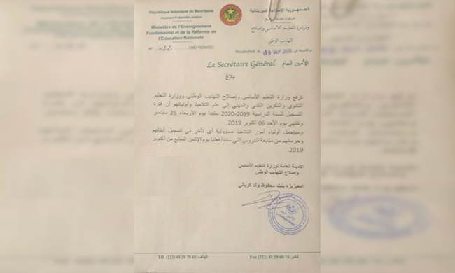أعلنت وزارتا التعليم الأساسي وإصلاح التهذيب الوطني ووزارة التعليم الثانوي والتكوين التقني والمهني عن موعد التسجيل للعام الدراسي الجديد 2019/2020. وأضاف بلاغ صادر عن الوزارتين أن التسجيل سيبدأ يوم الأربعاء 25 سبتمبر الجاري وينتهي يوم الأحد الموافق 06 أكتوبر المقبل. وحمل البلاغ أولياء أمور التلاميذ المسؤولية عن “أي تأخر في …