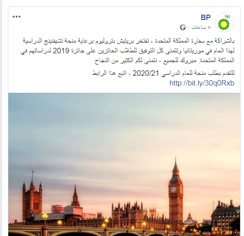 أعلنت شركة “بريتيش بتروليوم” أنها قررت رعاية منح دراسية لهذا العام في موريتانيا. وأوضحت الشركة في إعلانها أن برنامج المنح الدراسية يجري تنفيذه بالتعاون مع السفارة البريطانية في نواكشوط. وأحالت الشركة الراغبين في الاستفادة من هذه المنح من الطلاب الموريتانيين الدخول إلى الرابط، حيث بإمكان متابعة أخبار هذه المنح بالضغط هنا.