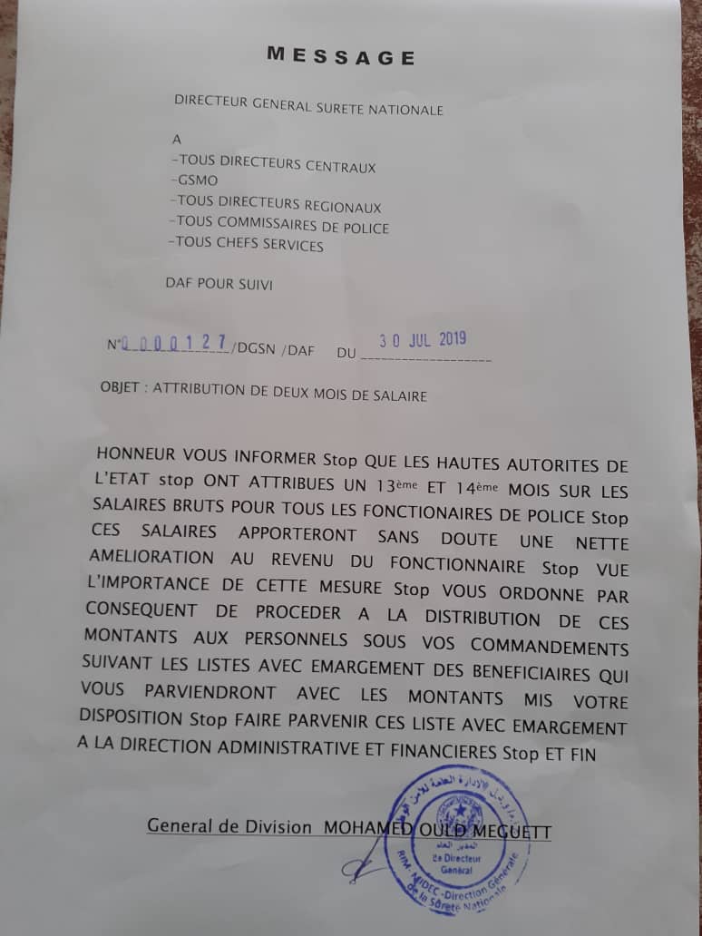 أصدر المدير العام للأمن الوطني الفريق محمد ولد مكت أمرا لقادة الشرطة بتقديم منحة مالية لجميع العاملين في القطاع بواقع راتبين لكل عنصر. المدير أرسل تعميما إلى كل الإدارات المركزية والإدارات الجهوية وكذلك رؤساء المصالح عبر الإدارة الإدارية والمالية. وجاء في الرسالة أن السلطات العليا أمرت بمنح راتبين لكل موظفي …