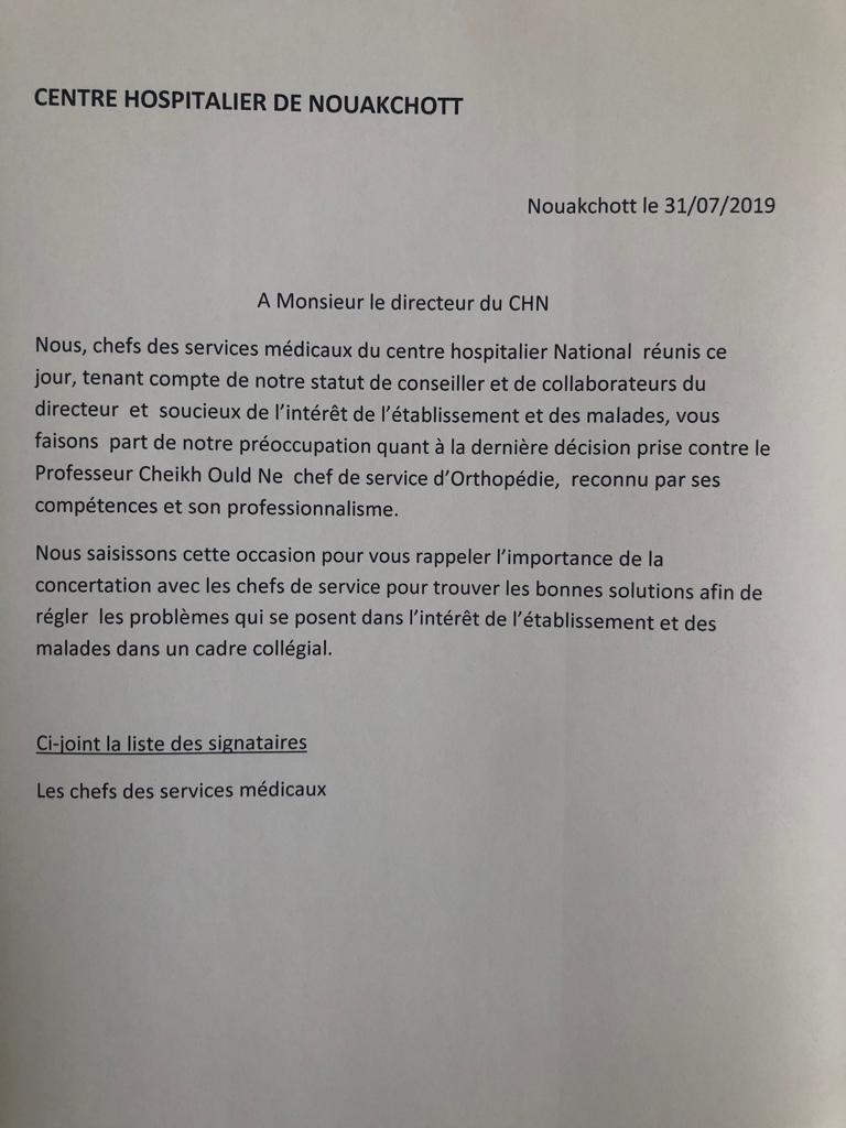 عبر رؤساء المصالح الطبية بمركز الاستطباب الوطني في نواكشوط عن قلقهم تجاه القرار القاضي بإقالة البروفسور الشيخ ولد ان، من رئاسة مصلحة جراحة العظام. وأكد رؤساء المصالح في رسالة بعثوا بها إلى مدير المركز، على “أهمية التشاور” معهم “من أجل إيجاد الحلول المناسبة لتسوية المشاكل التي تحصل”. وقد …