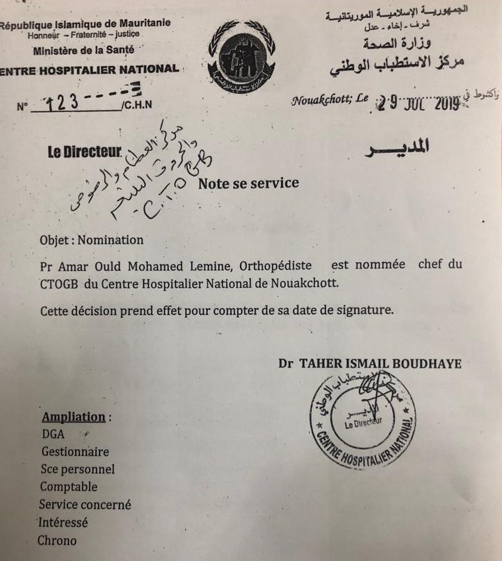 أعلن الاثنين عن تعيين الوزير السابق أعمر ولد محمد الأمين مديرا لمركز العظام والرضوض والحروق البليغة CTOGB. وصدرت مذكرة التعيين أمس الاثنين 29 يوليو 2019 عن مدير مركز الاستطباب الوطني الطاهر ولد إسماعيل. ويخلف ولد محمد الأمين المدير السابق للمركز شيخنا ولد الن. وحسب مصدر صحي تحدث …
