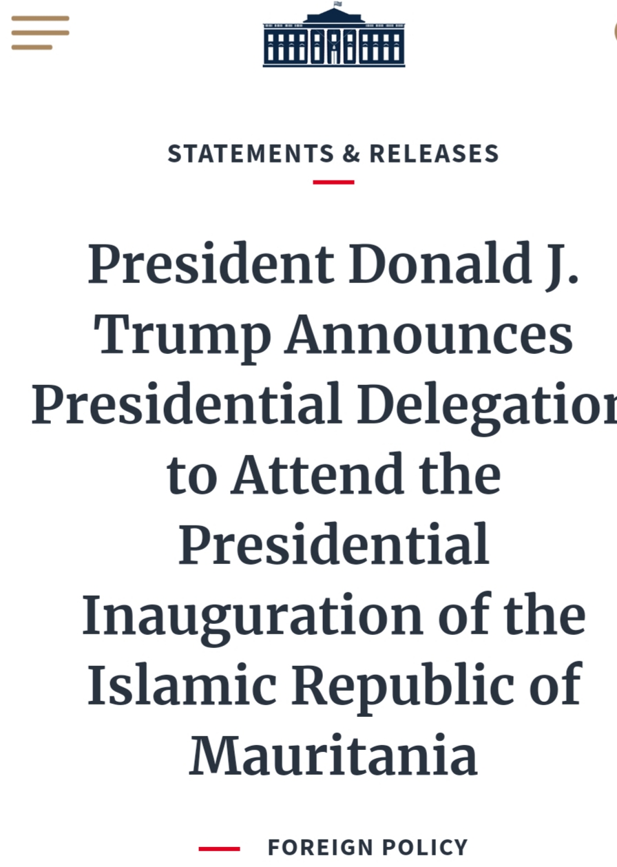 أعلن الرئيس الأمريكي دونالد ترامب في بيان نشره موقع البيت الأبيض تعيين وفد رئاسي إلى نواكشوط لحضور حفل تنصيب الرئيس المنتخب محمد ولد الشيخ الغزواني يوم الخميس فاتح أغسطس 2019. وجاء في البيان الذي ترجمه مركز الصحراء أن الوفد يرأسه السيد جون ديفر ألكساندر الثالث ، كبير مستشاري الطاقة في …