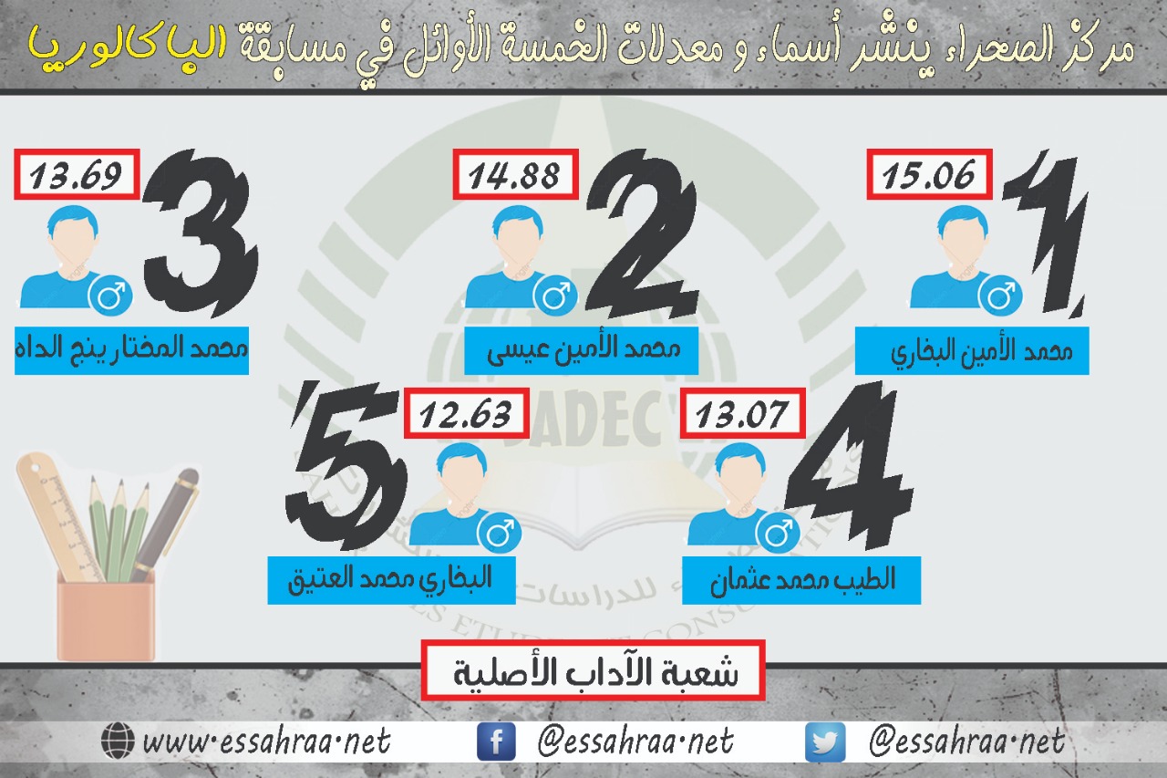 نشرت وزارة التهذيب الوطني اليوم الاثنين نتائج مسابقة الباكالوريا في جميع الشعب. و في هذا الصدد أعد القسم الفني بمركز الصحراء انفوكراف بأسماء و معدلات الخمسة الأوائل في شعبة الآداب الأصلية، حيث حل أولا التلميذ محمد الأمين البخاري بمعدل 15.06 تلاه التلميذ محمد الأمين عيسى بمعدل 14.88، و جاء التلميذ محمد المختار ينج …