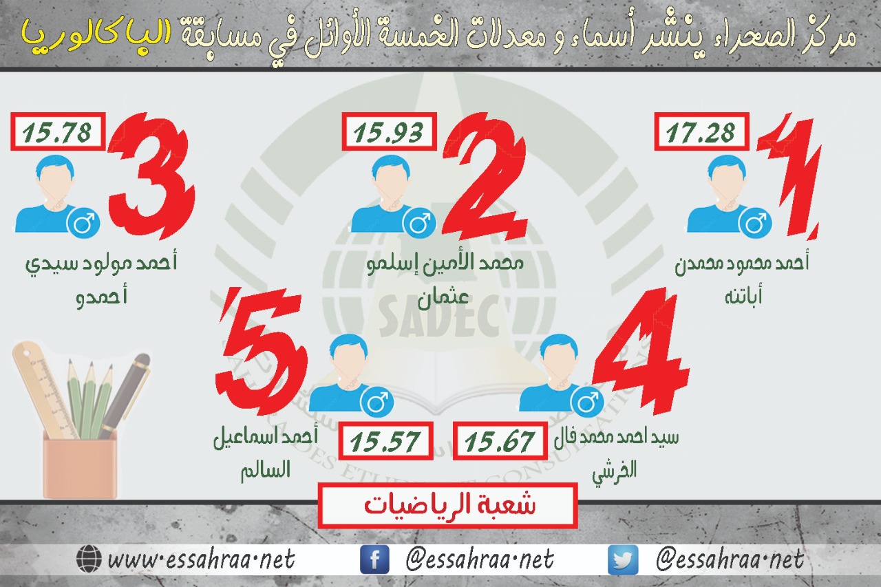 نشرت وزارة التهذيب الوطني اليوم الاثنين نتائج مسابقة الباكالوريا في جميع الشعب. و في هذا الصدد أعد القسم الفني بمركز الصحراء انفوكراف بأسماء و معدلات الخمسة الأوائل في شعبة الرياضيات، حيث حل أولا التلميذ أحمد محمود محمدن اباتنه بمعدل 17.28 تلاه التلميذ محمد الأمين اسلمو عثمان بمعدل 15.93، و جاء التلميذ أحمد …