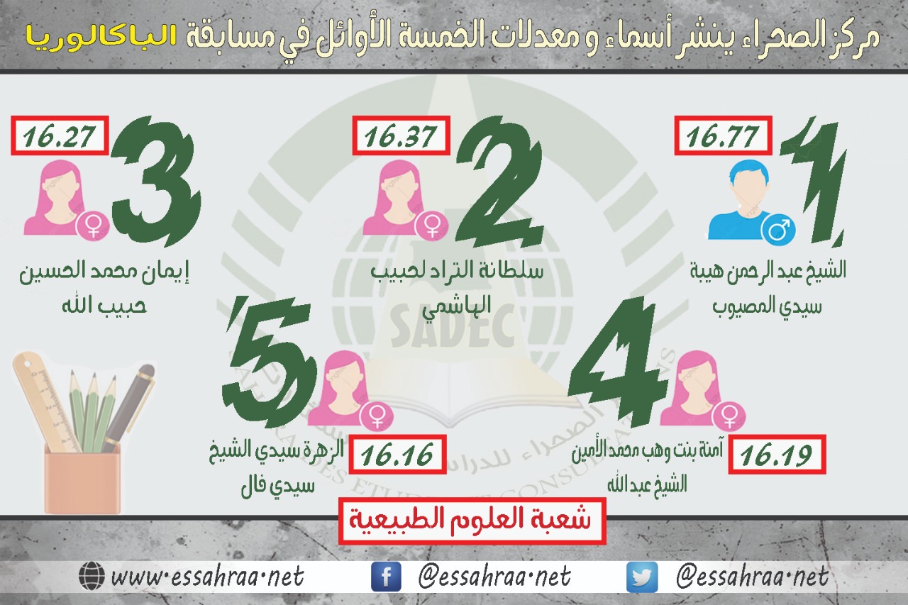نشرت وزارة التهذيب الوطني اليوم الاثنين نتائج مسابقة الباكالوريا في جميع الشعب. و في هذا الصدد أعد القسم الفني بمركز الصحراء انفوكراف بأسماء و معدلات الخمسة الأوائل في شعبة العلوم الطبيعية، حيث حل أولا التلميذ الشيخ عبد الرحمن الهيبة سيدي المصيوب بمعدل 16.77 تلته سلطانة التراد لحبيب الهاشمي بمعدل 16.37، …