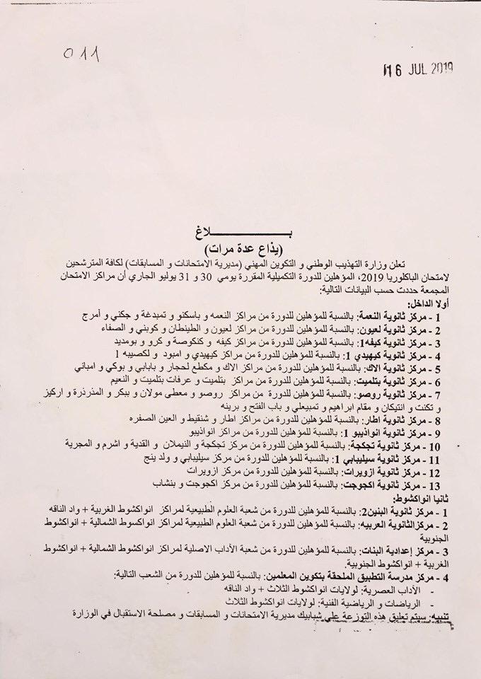 أعلنت مديرية الامتحانات والمسابقات بوزارة التهذيب قائمة المراكز التي سترجى فيها الدورة التكميلية لامتحانات الباكلوريا، يومي 30 و31 يوليو. وقالت مديرية الامتحانات في بلاغ لها إن الامتحانات ستجرى في المراكز التالية: أولا الداخل: مركز ثانوية النعمه: بالنسبة للمؤهلين للدورة من مراكز، النعمه، باسكنو، تمبدغه، جكني، أمرج مركز ثانوية …