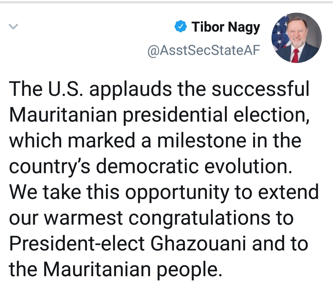 أشاد مساعد كاتب الدولة للشؤون الإفريقية الأمريكي Tibor Nagy بالانتخابات الموريتانية وقدم التهنئة للرئيس المنتخب محمد ولد الشيخ الغزواني. وقال المسؤول الأمريكي في تغريدة له على اتويتر: تشيد الولايات المتحدة بالانتخابات الرئاسية الموريتانية الناجحة ، والتي شكلت علامة فارقة في التطور الديمقراطي في البلاد. ننتهز هذه الفرصة لتقديم أحر تهانينا للرئيس …
