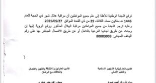 دعت اللجنة الوطنية لمراقبة الأهلة جميع المواطنين لتحري هلال شهر ذي الحجة لعام 1446 هـ، وذلك مساء يوم غد الثلاثاء 29 ذي القعدة الموافق 27 مايو 2025. جاء ذلك اليوم، عبر بيان نشرته الصفحة الرسمية لوزارة الشؤون الإسلامية على الفيسبوك، دعت فيه المواطنين إلى تحري الهلال والإبلاغ عن أي رؤية …