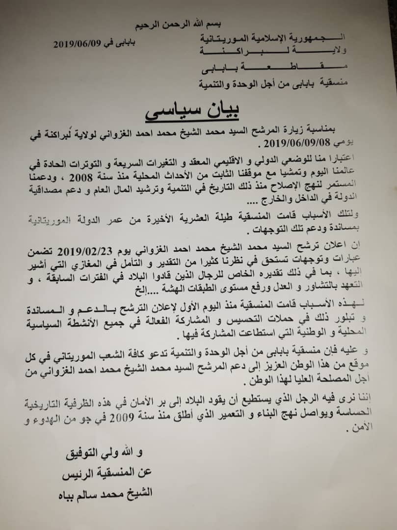 اصدرت منسقية بابابي من أجل الوحدة والتنمية بيانا سياسيا بمناسبة زيارة المرشح محمد الشيخ ولد محمد أحمد الشيخ الغزواني لولاية لبراكنة يومي الثامن والتاسع من هذا الشهر, جاء في هذا البيان أن هذه المنسقية كانت ولاتزال تدعم هذا النهج منذ 2008 وانا ترى في هذا المرشح الشخص القادر على قيادة البلاد الى بر الأمان في …