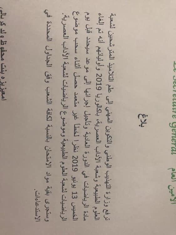 رفعت وزارة التهذيب الوطني الى علم التلاميذ المترشحين لمسابقة الباكالوريا ، شعبة العلوم الطبيعية و شعبة الآداب العصرية انه تم الغاء مادة الرياضيات مادة الرياضيات في الدورة العادية. و أجلت الوزارة في تعميم موقع من قبل الأمانة العامة إجراء هذه المادة الى موعد سيحدد قبل يوم الخميس المقبل. و ستجدى …