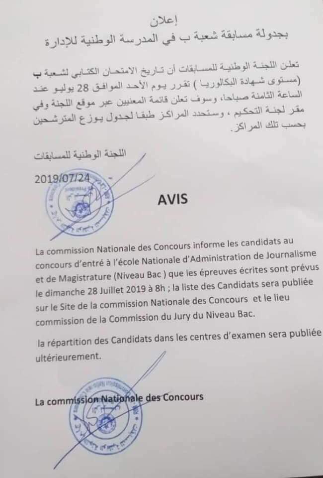أعلنت اللجنة الوطنية للمسابقات عن تأجيل الامتحان الكتابي لفئة حملة الباكلوريا إلى غاية يوم الأحد القادم. وجاء تأجيل الامتحان إلى 28 يوليو بدلا من يوم غد الخميس الذي كان مقررا، بحسب إعلان أصدرته اللجنة سابقا. وأضاف بيان صادر عن اللجنة، أنها ستعلن قائمة المعنيين بالامتحان ومراكزهم خلال الأيام القادمة.