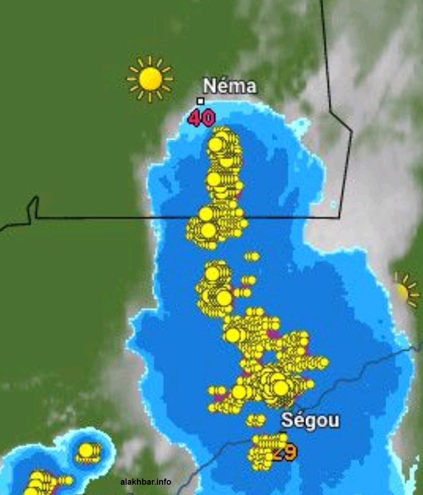 أظهرت صور الأقمار الصناعة وجود أمطار على جنوب ولايتي الحوض الشرقي والغربي، شرقي موريتانيا. كما أظهر الصور تمدد الأمطار الكثيفة على كل الأراضي المالية المجاورة. وعرفت مناطق واسعة من شرق وجنوب موريتانيا أمطارا كثيفة خلال الأيام الأخيرة، حيث غطت الأمطار جل ولايات الحوضين، والعصابة، وكيدماغا، وكوركل.