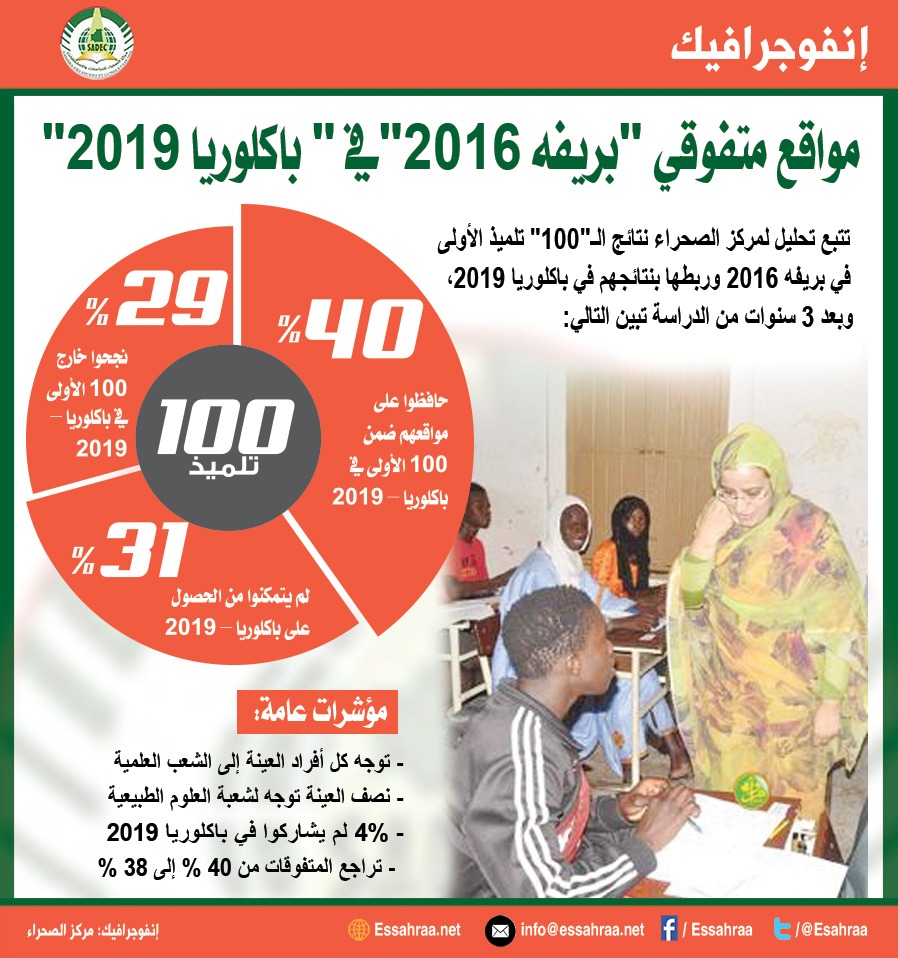 أجرى مركز الصحراء تحليلا شمل الـ 100 الأولى في مسابقة بريفه 2016، ونتائجهم في باكلوريا 2019، وأظهر التحليل أن جميع أفراد العينة توجهوا إلى الشعب العلمية. وحافظ 40 في المائة من العينة على مواقعهم في المائة الأولى في باكلوريا 2019، فيما نحج 31 في المائة، لكن خارج المائة الأولى. وتشير …