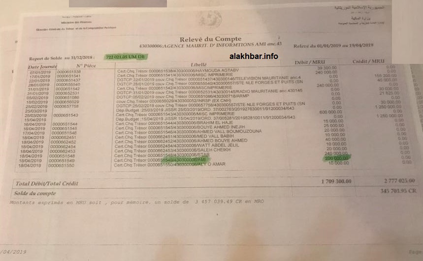 كشفت حسابات ومعلومات حصلت عليها الأخبار اختلالات وصرف مريب لميزانية تسير الوكالة الرسمية خلال السنة المنصرمة، وبداية العام الحالي، ذهب بموجبها عشرات الملايين لشركات خصوصية وأفراد. وأظهرت الأرقام الإجمالية أن الوكالة أنهت العام 2018 بعجز أكثر من سبع مليون أوقية، وهو ما يعني إنفاق أكثر من 350 مليون أوقية …
