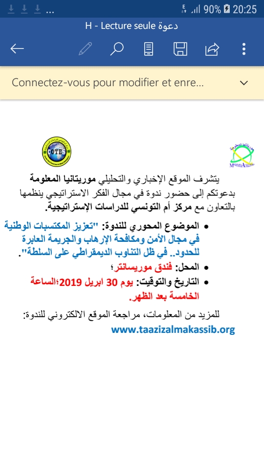 سينظم الموقع الإخباري والتحليل (موريتانيا المعلومة) ندوة حول الفكر الإستراتجي بالتعاون مع مركز (أم التونسي) للدراسات الإستراتجية ،حيث سيكون موضوع الندوة تعزيز المكتسبات الوطينية في مجال الأمن ومكافحة الإرهاب و الجريمة العابرة للحدود ، في ظل التناوب الديموقراطي على السلطة ، وستقام الندوة في فندق مورى سانتر يوم 30 ابريل …