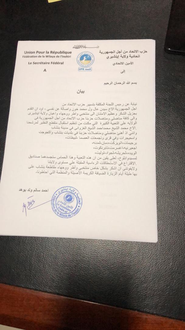 أصدر حزب الإتحاد من أجل الجمهورية بيانا هنأ فيه منتخبي وأطر ووجهاء ولاية إنشير على الإستقبال الحاشد الذي نظمه ساكنة الولاية في مقاطعة بنشاب أحتفاء بمرشح أحزاب الأغلبية السيد ، محمد ولد الشيخ محمد أحمد ولد الغزواني، وعلى حسن التنظيم ومستوى السلوك . وهذا نص البيان.