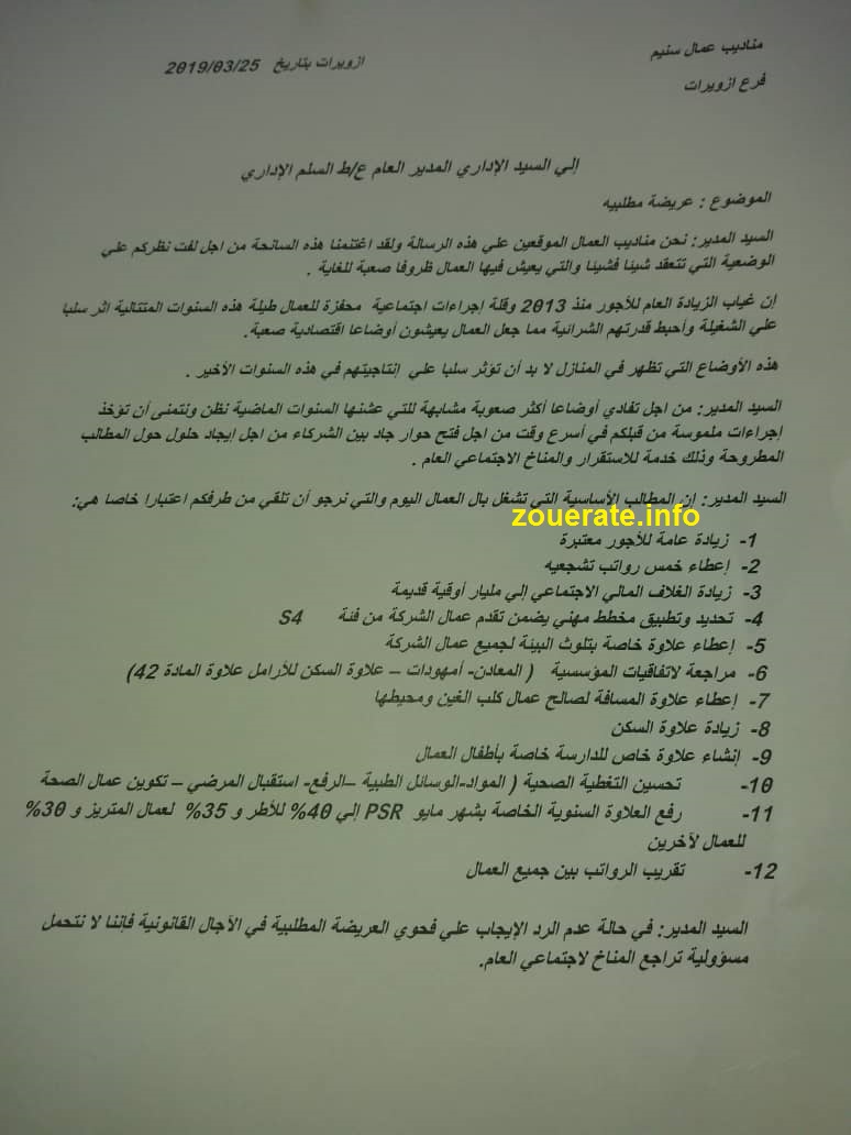 أعلن مناديب عمال شركة تازيازت موريتانيا عن اتجاههم للدخول في إضراب مفتوح عن العمل يوم 29 ابريل 2019 عند الساعة صفر، حيث أودع المناديب إنذارا لدى إدارة الشركة بعزمهم خوض الإضراب. وتضمنت الإخطار العريضة المطلبية للعمال الذين يتهمون الشركة بالتحول من استغلال الثروات الي استغلال عرق جبين العامل الموريتاني على …