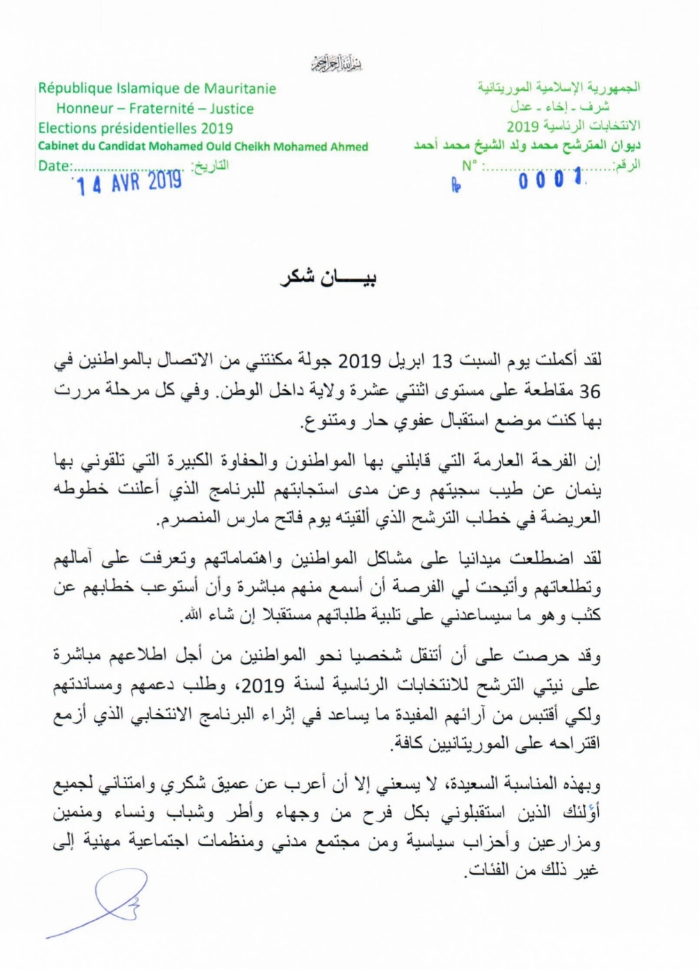 أكد المرشح للرئاسيات محمد ولد الشيخ محمد أحمد أن الزيارة التي نظمها ل 36 مقاطعة مكنته من الاطلاع على مشاكل المواطنين وتعرف على آمالهم وتطلعاتهم مما سيساعده في تلبية مطالبهم مستقبلا وكشف ولد الغزواني في رسالة وزعتها حملة المرشح أنه سيقتبس من آراءهم التي وصفها بالمفيدة لإثراء البرنامج الانتخابي له …