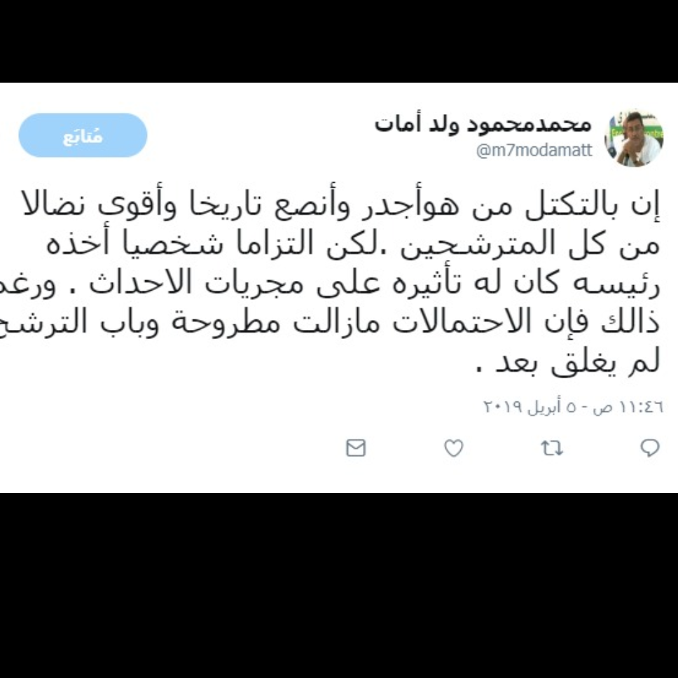 قال نائب رئيس حزب التكتل محمد محمود ولد لمات إن باب الترشح للانتخابات الرئاسية لم يغلق بعد، وفى حزب التكتل من هو أجدر بالترشح من كل الذين أعلنوا ترشحهم لحد الآن. وأضاف ولد لمات فى تغريدة على حسابه بتوتير إن قرار الحزب أثر عليه التزام شخصى لرئيسه، مؤكدا أن كل …