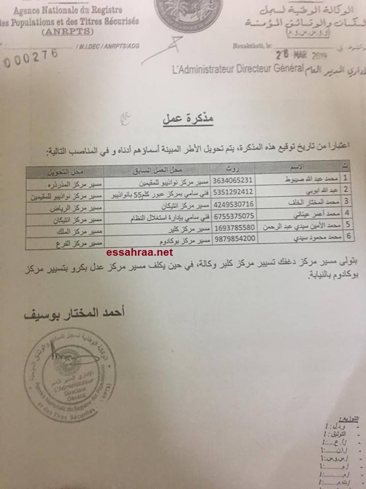 أصدر أحمد المختار بوسيف مدير وكالة سجل السكان والوثائق المؤمنة مذكرة تحويلات شملت 6 مراكز تابعة للوكالة في مناطق مختلفة من البلاد. وتضمنت هذه التحويلات نقل مسيري مراكز نواذيبو وانتيكان وكلير وبوكادوم على التوالي إلى المذرذره والرياض والملكه والفرع، فيما كلف اثنان من الفنيين السامين بتسيير مركزي نواذيبو وانتيكان. ونصت …
