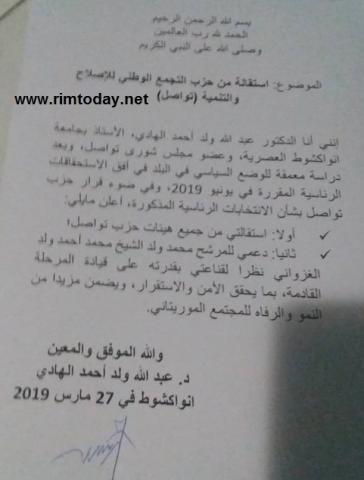 أعلن السياسي البارز والأستاذ الجامعي، الدكتور عبد الله ولد أحمد الهادي؛ انسحابه من حزب التجمع الوطني للإصلاح والتنمية (تواصل) المعارض؛ واستقالته من عضوية مجلس الشورى التابع لهذا الحزب . وجاء في نص بيان استقالة ولد أحمد الهادي أنه “بعد دراسة معمقة للوضع السياسي في البلد في أفق الاستحقاقات الرئاسية المقررة …