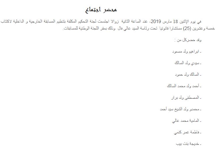 نشرت لجنة المسابقات تشكيلة إحدى لجان التحكيم التابعة لها، حيث أعلنت اللجنة أن اجتماعا عقدته هذه اللجنة يوم أمس الاثنين خصص لدراسة ملفات المترشحين لمسابقة اكتتاب 25 مستشارا قانونيا. وفيما يلي تشكيلة لجنة التحكيم هذه التي تتكون من رئيس و9 أعضاء: الرئيس السيد عالي فال الأعضاء: ـ ابراهيم ولد مسعود …