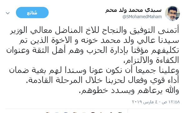 وصف رئيس حزب الاتحاد من أجل الجمهورية المنصرف سيدي محمد ولد محم أعضاء اللجنة التي كلفت بإدارة الحزب مؤقتا خلال تعليق المؤتمر بأنهم “أهل الثقة وعنوان الكفاءة والالتزام”. ودعا ولد محم في تغريدة على حسابه في اتويتر الجميع لأن يكونوا “عونا وسندا لهم بغية ضمان أداء قوي وفعال لحزبنا …