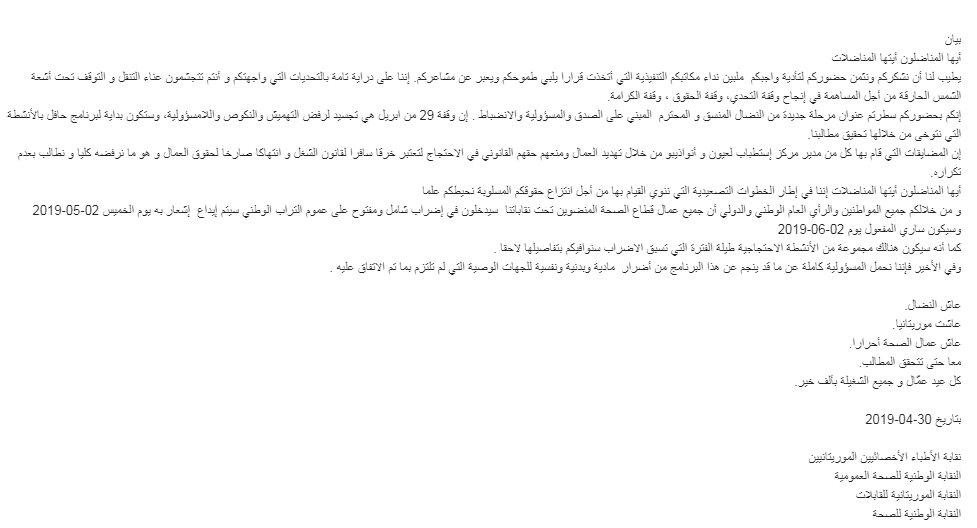 أعلنت نقابات عمال الصحة في بيان مشترك عن اتخاذها قرارا بالمضي نحو تنظيم إضراب شامل ومفتوح على عموم التراب الوطني، ووضعت النقابات مهلة شهر لتنظيم هذا الإضراب. وأضاف البيان أن إشعار الإضراب سيودع يوم غد الخميس 2-5-2019 على أن يكون الإضراب ساري المفعول ابتداء من الأحد 2-6-2019. ووقع البيان من …